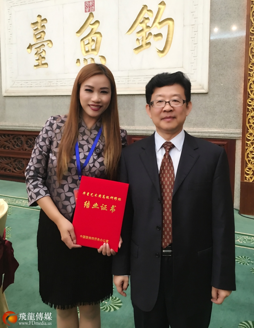陈铁梅手捧结业证书与国侨办宣传司许玉明司长合影。