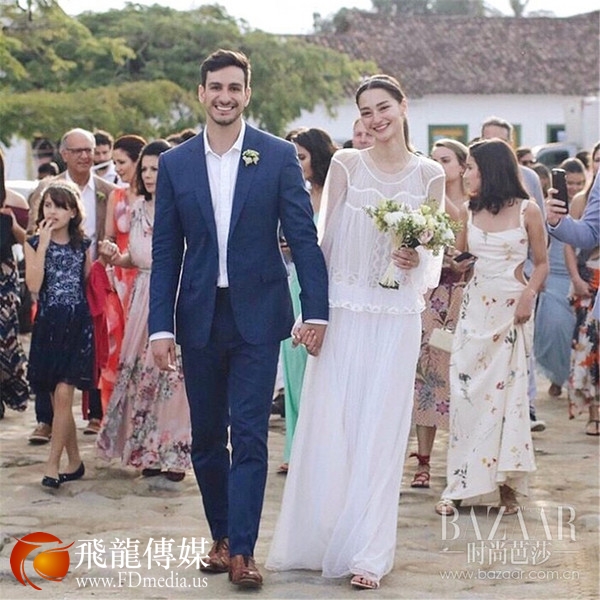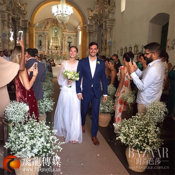 布鲁娜与男友Felipe Faria的婚礼地点选择了一个有山有水的小镇,仪式则在当地的教堂内举行。
