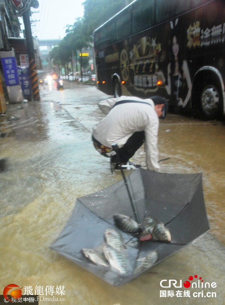 2017年6月2日,台湾,基金一路淹大水后,有民众苦作乐,用雨伞捡了好多鱼。图片来源:视觉中国