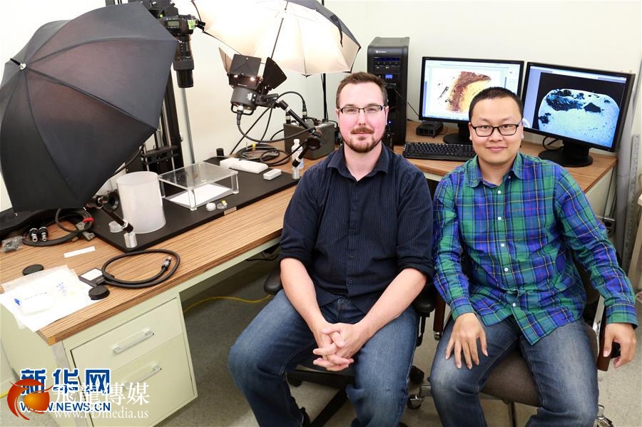 科学家首次在琥珀中发现雏鸟标本图为邢立达与加拿大萨斯喀彻温省皇家博物馆瑞安·麦凯勒教授的工作合影。新华社发