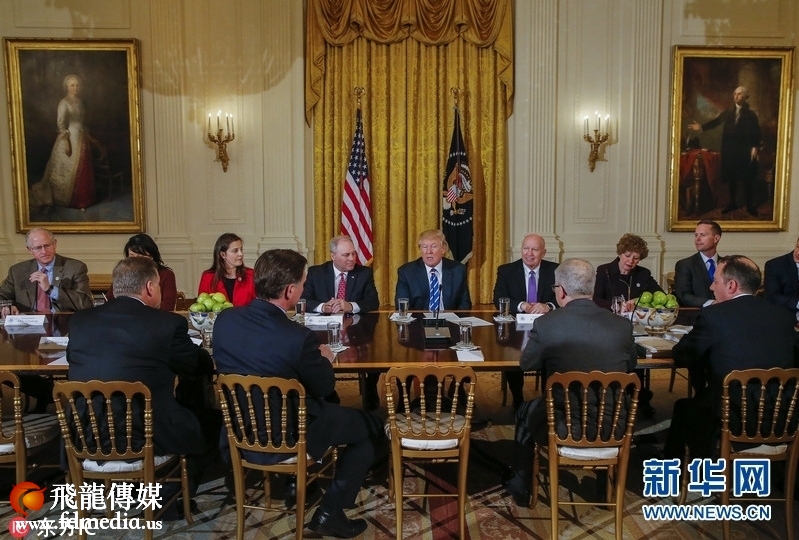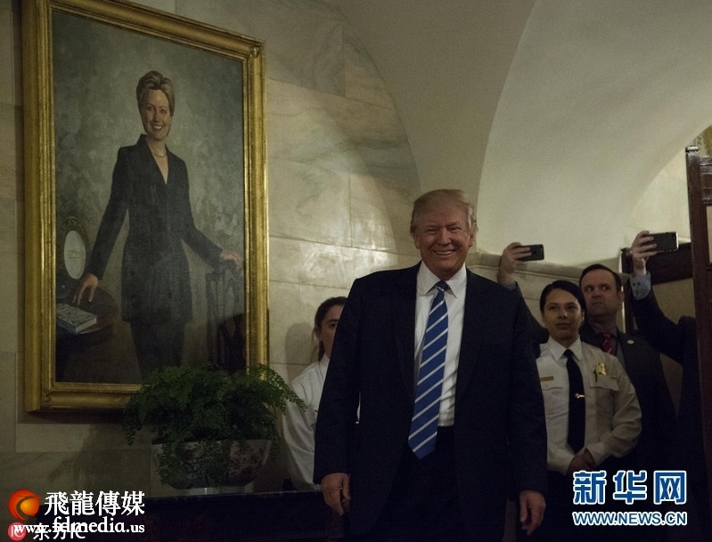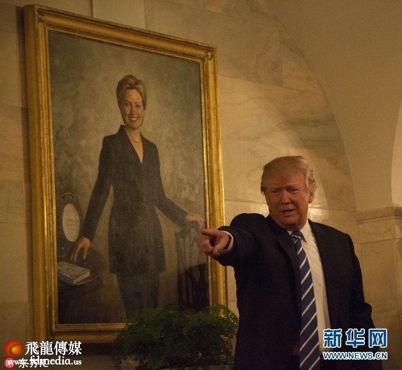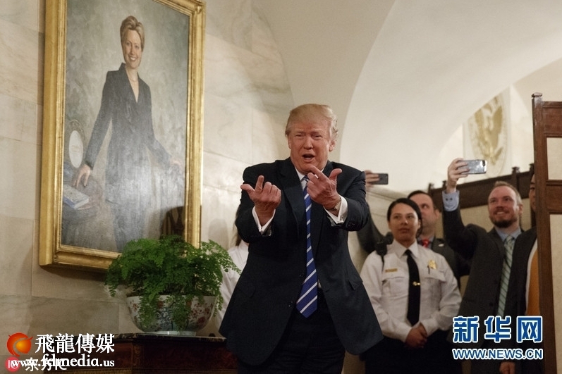 美国时间2017年3月7日,美国华盛顿,特朗普问候白宫游客,墙壁上悬挂有希拉里-克林顿画像。美国总统特朗普就职后,白宫迎来第一拨游客。