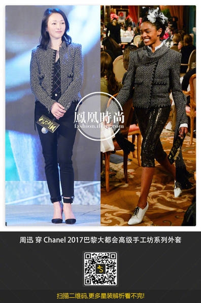 当天周迅身着CHANEL 2017巴黎大都会高级手工坊软呢外套,简约大方,身材比过去略显丰润。