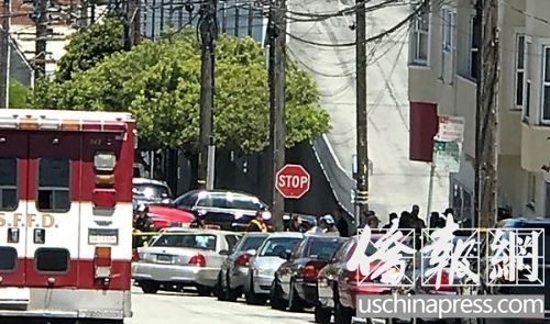 旧金山警方封锁UPS枪击案现场,救护车也在现场待命。(侨报记者陈勇青摄)
