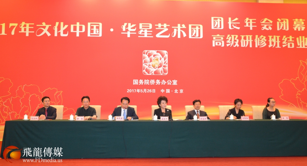 中国国务院侨办裘援平主任、谭天星副主任、侨办宣传司司长许玉明、副司长刘为杰等领导出席“2017年文化中国.华星艺术团团长年会闭幕式暨高级研修班的结业典礼。