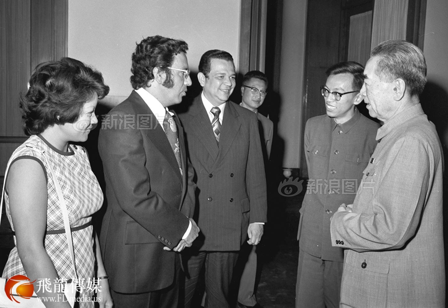 1973年5月16日,周恩来总理在北京会见巴拿马工商部长费尔南多·曼弗雷多(左二)和夫人以及随同来访的巴拿马驻香港总领事米格尔·埃·查维斯(左三)。