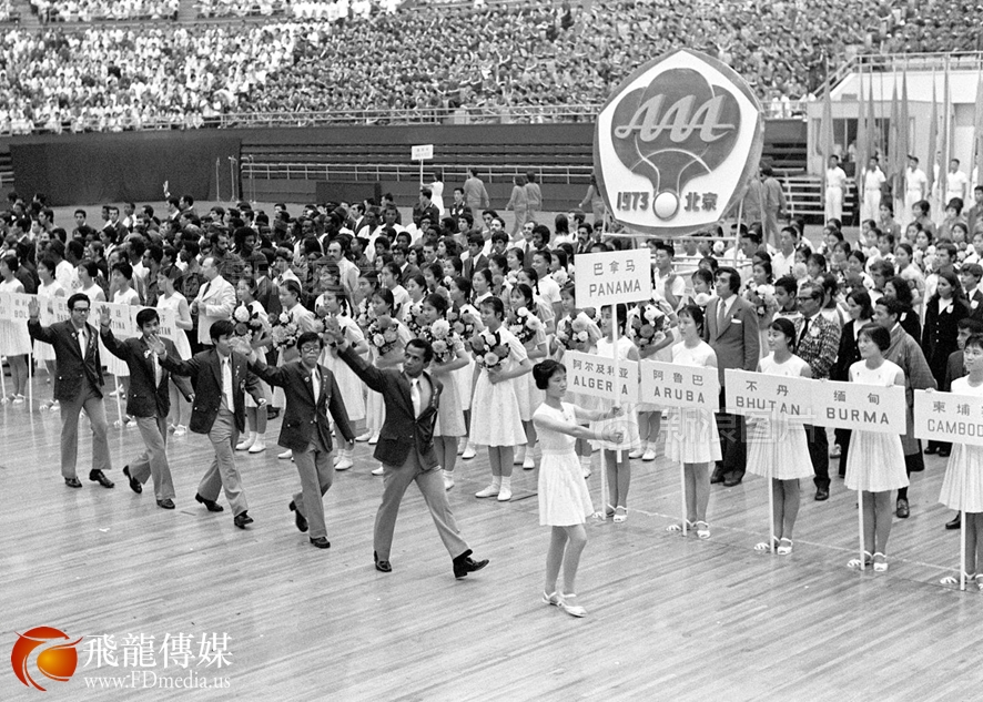 1973年8月25日,亚非拉乒乓球友好邀请赛在北京首都体育馆开幕,巴拿马运动员入场。供图|新华社
