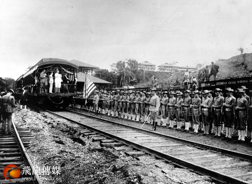 巴拿马地峡连接南北美洲,分隔太平洋和大西洋,战略位置十分重要。作为美军帮助巴拿马独立的交换条件,巴拿马把宽10英里、面积1432平方公里的运河区交给美国永久占领、控制。西奥多·罗斯福总统下令开凿运河。图为1906年11月,罗斯福总统到巴拿马运河区考察。