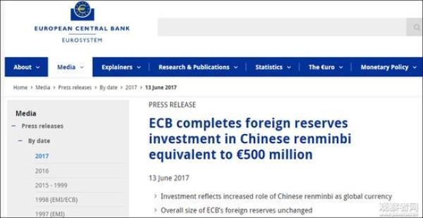 据美国《华尔街日报》、英国《金融时报》等外媒称,这是欧洲央行首次对人民币进行外汇储备投资。