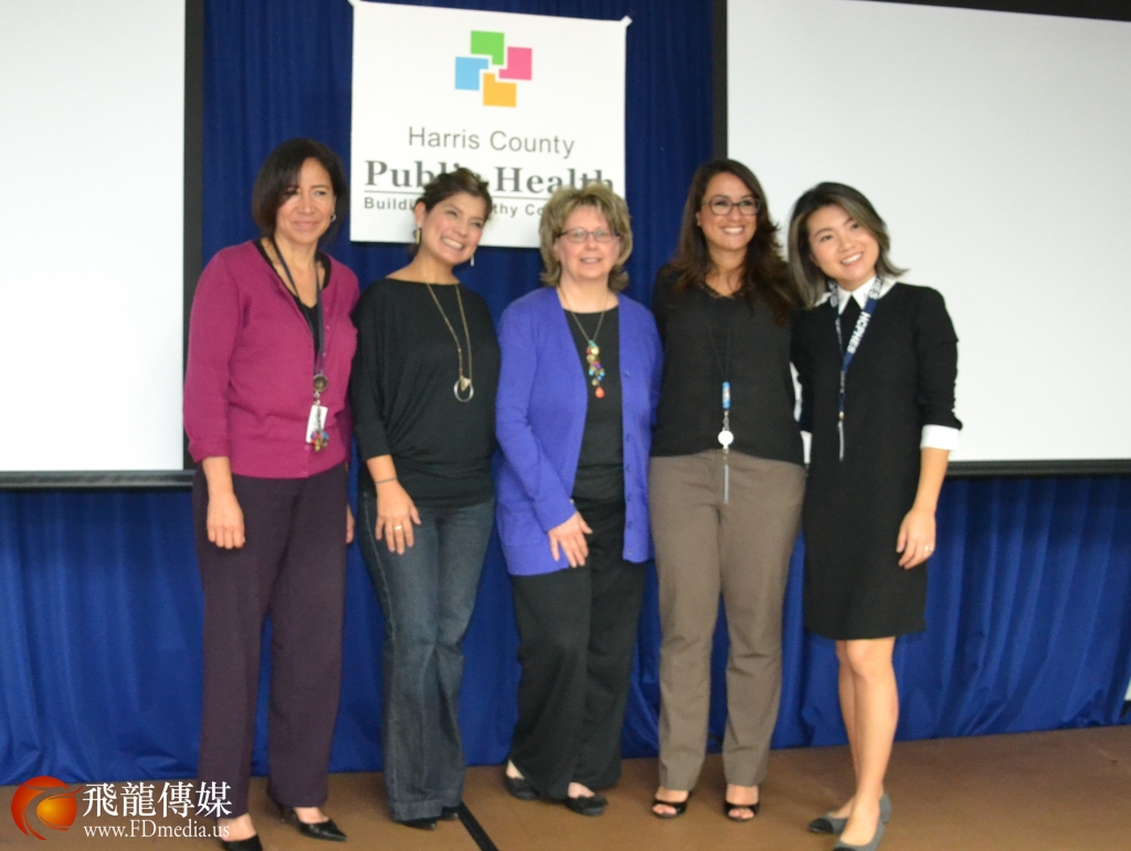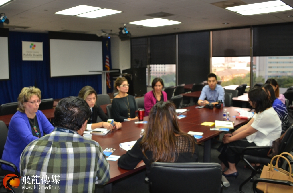 Harris 县的公共健康部门公务员葛迪之(右一)召集休斯顿华文媒体记者,到 Harris 县公共健康办公室参加记者会,Harris 县高级公共信息官员(Senior Public info Officer) Sandy Kachur 和 Director Elizabeth Perez 分别做了发言,并与记者就如何提高亚裔公共健康问题展开讨论,希望听取亚裔社区的声音,更好的为亚裔公共健康做好服务。