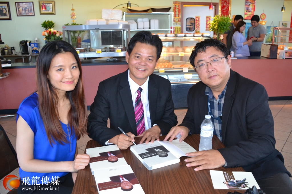 纽约虾老顺口溜作者何启新签名赠书给飞龙传媒公共事务部&飞龙电视主持人利娅萁和世界名人网总编王福生。