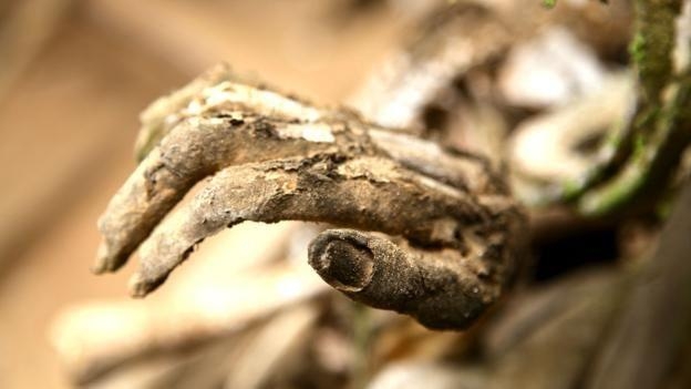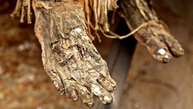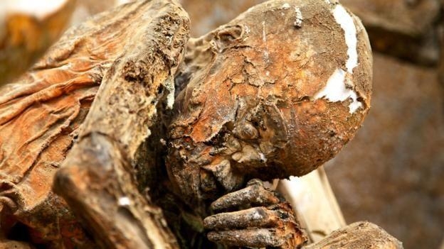 木乃伊比我曾想象的更加令人毛骨悚然。木乃伊上涂抹着红色的粘土,分别处于不同的腐烂阶段,皮肤和肌肉的干燥部分紧贴在骨骼上。有些木乃伊仍有成块的毛发和完整的指甲,忧郁地蜷缩成一团。