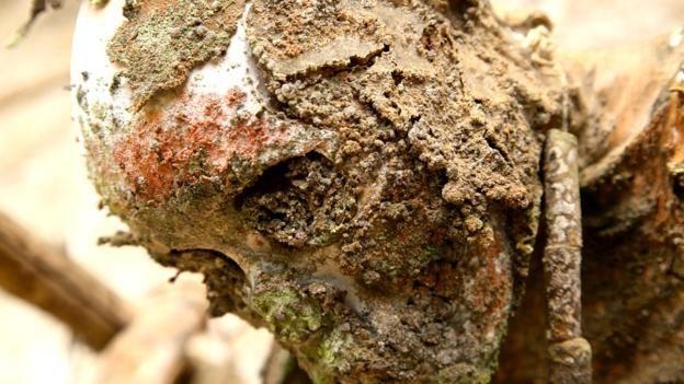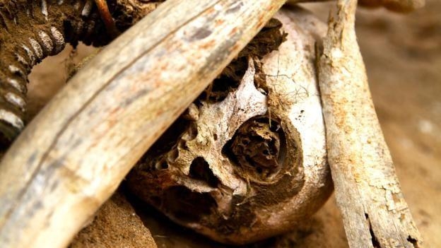 他们的面部表情好像直接来自好莱坞的尖叫电影节,牙齿和眼球完好,从头骨中向外鼓出。在其中一具女性尸体上,胸部还压着一个婴儿的熏制尸体