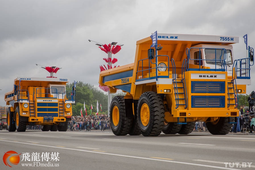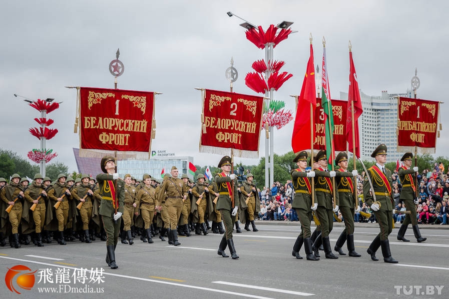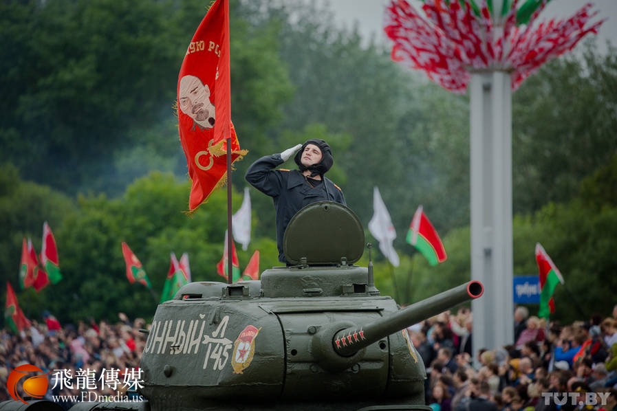 当天的阅兵式共有3500名军人参加。阅兵式上展示了二战期间的老式武器和白俄罗斯最新装备的装甲车和防空导弹系统。图为2辆中国国产红旗轿车分别作为阅兵车与前导车。