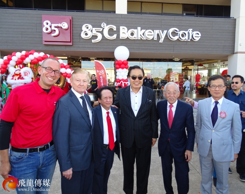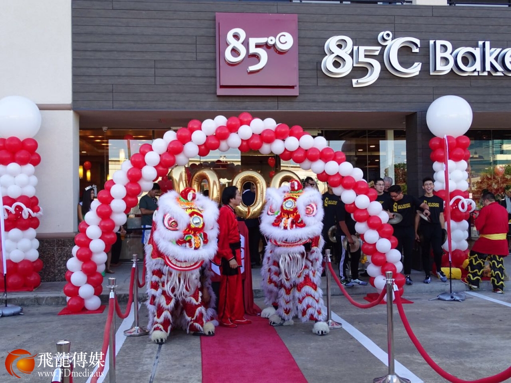 开业仪式上,锣鼓震天的舞狮表演,一片喜庆吉祥的气氛,驻休斯顿台北经济文化办事处处长黄敏境、美南报业传媒集团董事长李蔚华、Great land 地产投资有限公司负责人Stephen Le与Stephen Le Jr. 等侨界、政商名流云集,85°C创始人吴政学也与该公司台湾行销集团特地前来主持仪式,中外十几家媒体到场进行採访报道,现场十分热闹。