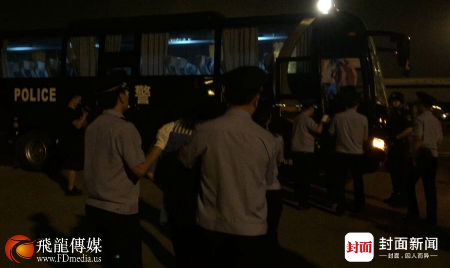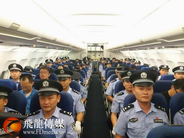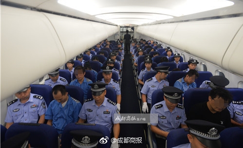 “3.05”特大跨国通讯诈骗案起源案件在四川广安。据专程赶到成都的公安部刑侦局副局长陈士渠说,这次在公安部的统一指挥下,四川、河南等警方会同柬埔寨当地警方抓获通讯诈骗嫌疑人。图为公安警察与17名通讯诈骗嫌犯乘机抵达成都。
