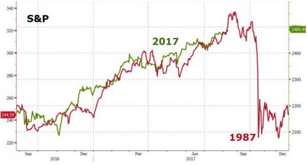 (图中红线为1987年标普指数走势,左侧纵坐标对应其点位;绿线为2017年标普指数走势,右侧纵坐标对应其点位)