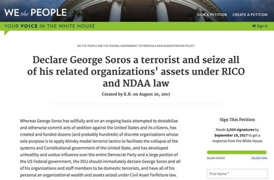 这份由E.B.于今年8月20日创建的请愿书,题为“宣布索罗斯为恐怖分子,依据RICO(《反诈骗腐败组织集团犯罪法》)和NDAA(《国防授权法》)法案,扣押和他相关的所有组织的资产!”