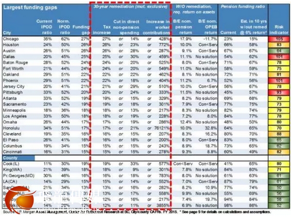 每日经济新闻记者注意到,下图是摩根大通根据美国每座主要城市年支付债务、养老金以及退休金占全年预算的比例来进行排名的。而这一排名的最终结果也让人大跌眼镜——知名城市芝加哥的风险指标最高,芝加哥具名60%以上税款将用于偿还债务和养老金,其次是达拉斯与菲尼克斯,以及匹兹堡。与此同时,还有十几座其他城市的年度预算中,超过50%用于为以往支出的维护成本提供资金。