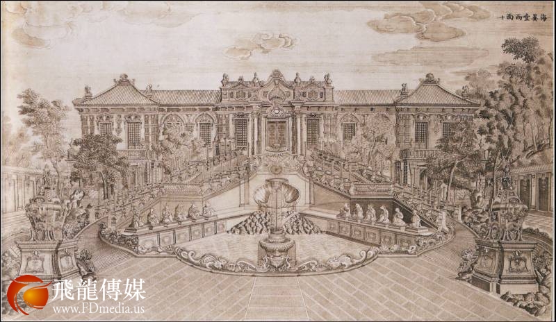事实上,如果仔细考察一下,我们可以发现这些所谓的“西洋楼”其实融合了很多中国因素,更准确地说是源自欧洲人想象中的“中国风”建筑的回应。最明显是,这组建筑都有着中式屋顶,而人身兽首的十二生肖像虽然明显使用了欧洲雕塑风格,但都身着中式长袍。因此,虽然对于中国观众来说这些“西洋楼”展示了外国建筑传统,但对于蒋友仁和其他在清廷工作的欧洲传教士来说,它们所代表的则是东西之间的文化交融。