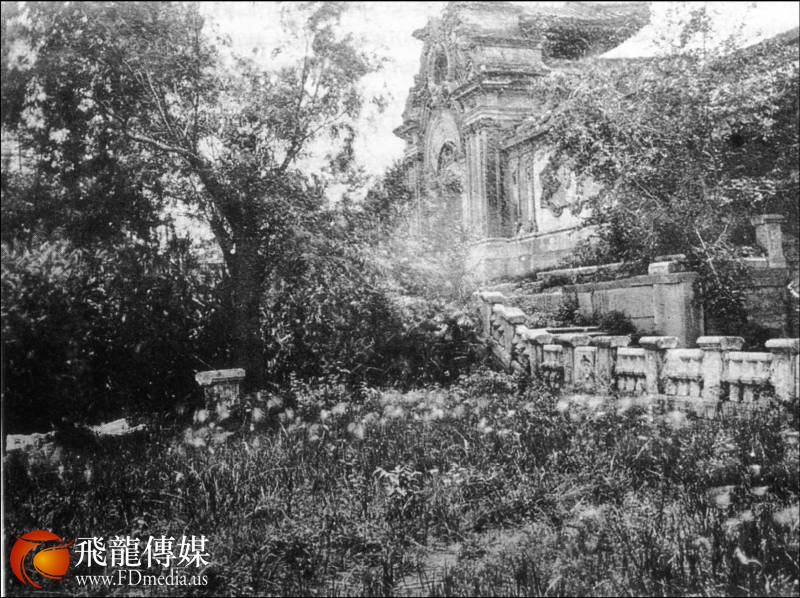 我们在陡峭的台阶上爬上爬下(对那些裹得紧紧的小脚来说,走这些石阶肯定不是件轻松的事情)。露台上爬满了野生的藤茎和有香味的野草,所有的石头都被火烧裂了。两个巨大的大理石麒麟雕刻精美,也是满身裂痕,几乎将要坍塌。八角形的三层楼已经所剩无几,只剩下白色大理石栏杆告诉我们它曾经所在的位置。