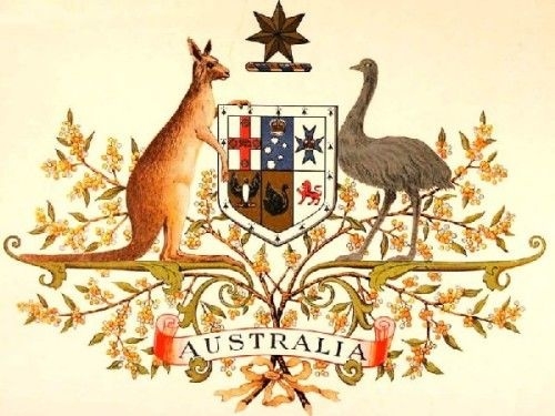 澳大利亚国徽,盾形两旁为红袋鼠和鸸鹋[ér miáo]是澳大利亚特有动物,为国家的标志、民族的象征。