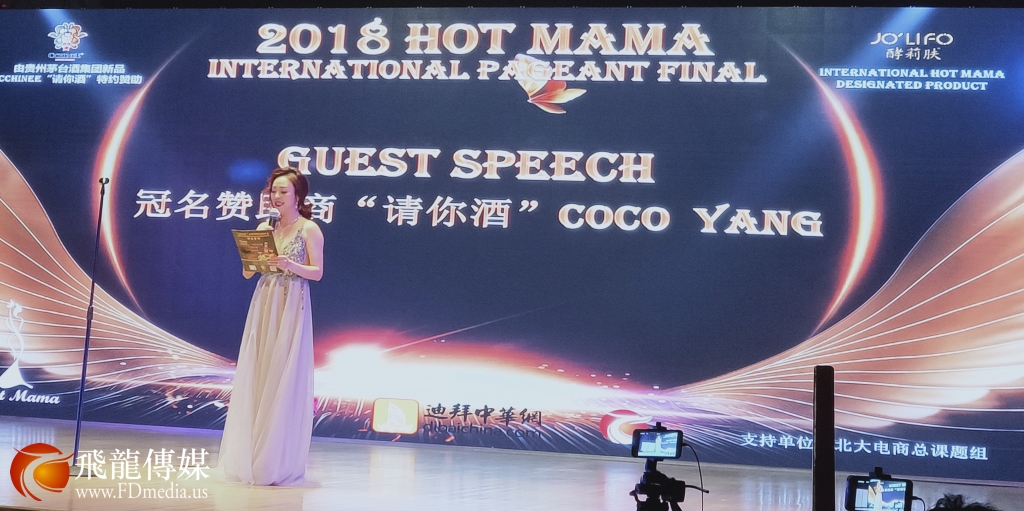 2018 Hot Mama International pageant Final总决赛由贵州茅台酒厂(集团)保健酒业有限公司、金壁国际控股有限公司CCHINEE“请你酒”特约赞助, 公司全球市场部总监 CoCo Yang 亲临现场支持,并在致辞中表示CCHINEE“请你酒”将继续支持International Hot Mama大赛。