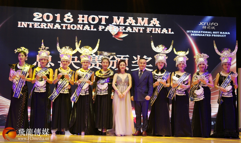HOT MAMA全球共同主席、毛戈平品牌创始人毛戈平先生与金壁国际控股有限公司全球市场部总监Ms. CoCo Yang为荣获《2018 Hot Mama International pageant Final》总决赛团体赛冠军的是来自中国贵州的辣妈参赛团颁奖。