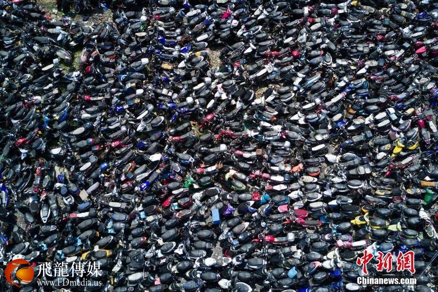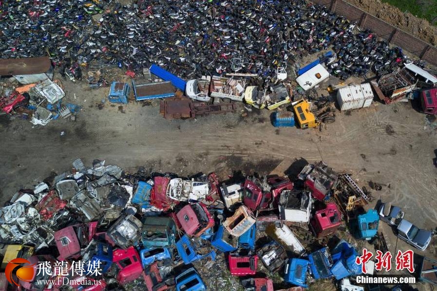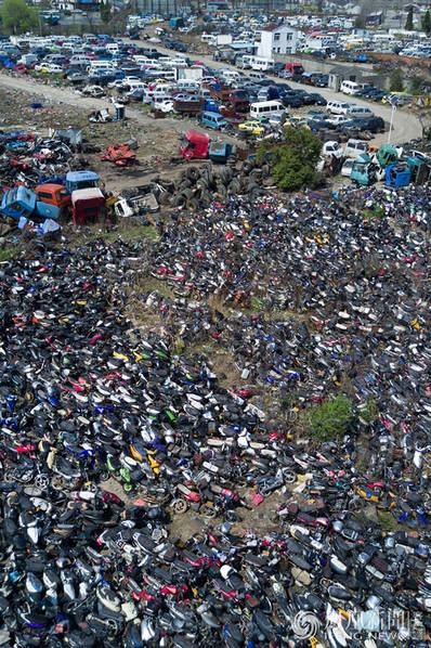 3月27日,航拍南京江北一处废旧机动车报废点,等待拆解的汽车和摩托车密密麻麻,犹如钢铁“坟场”。中新社记者 泱波 摄