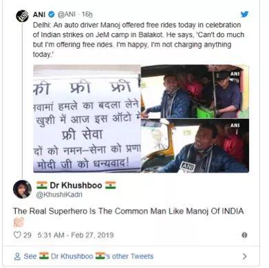 有印度媒体就报道说一名出租车司机为了庆祝印度空军狠狠教训了巴基斯坦,决定免费让乘客搭乘他的出租车。不少印度网民也纷纷给他点赞,说这位出租车司机也是个“英雄”。