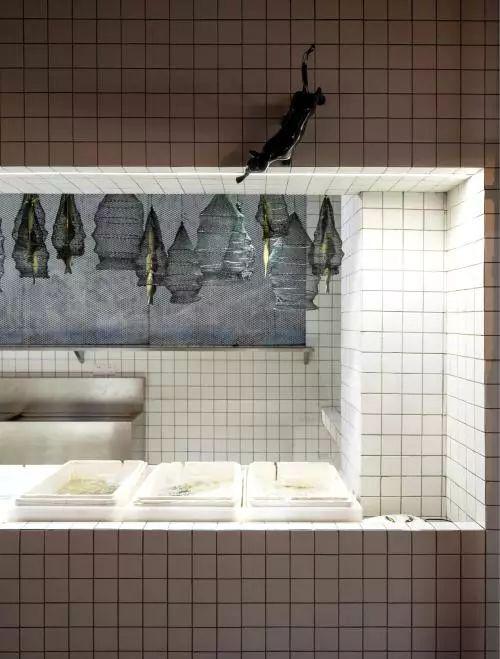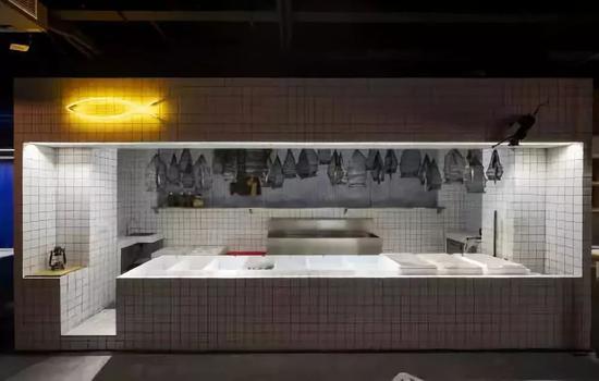 小白砖砌成吧台和门头,装上小鱼霓虹灯和一只小黑猫,生动有趣。