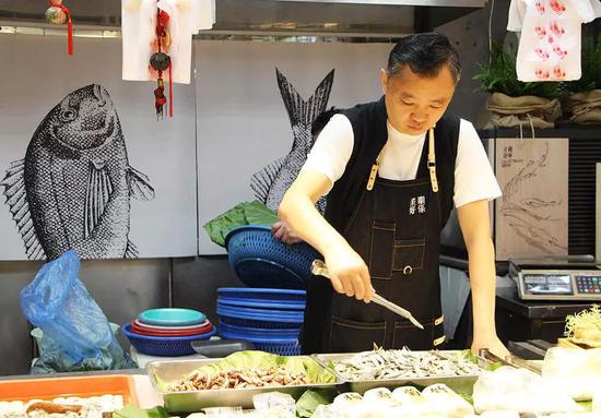 门对门的两家鱼摊,一家卖海鲜、一家卖千岛湖河生,两家店改成了不同的风格。