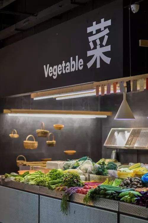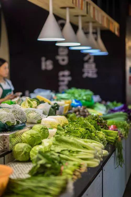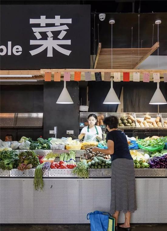 蔬菜摊最用心的地方是陈列和灯光的设计,用网眼不锈钢材质搭的柜台,高低不同,可以放更多种类的蔬菜。