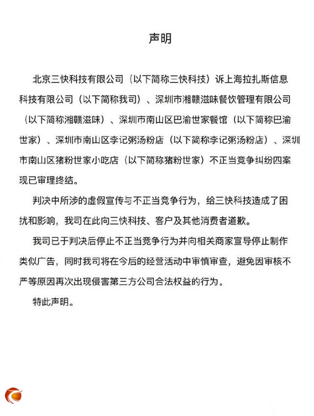 近日饿了么注册公司上海拉扎斯信息科技有限公司对外发布致歉声明,表示他们因不正当竞争向“美团”隶属的北京三快科技有限公司进行道歉,并表示在今后的经营活动中不会再出现侵权行为。