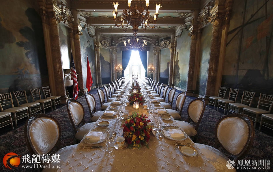 特朗普和习近平在海湖庄园一起品茶,相互介绍与会的高级官员,随后共进晚餐。图为欢迎晚宴现场,习近平与特朗普握手。