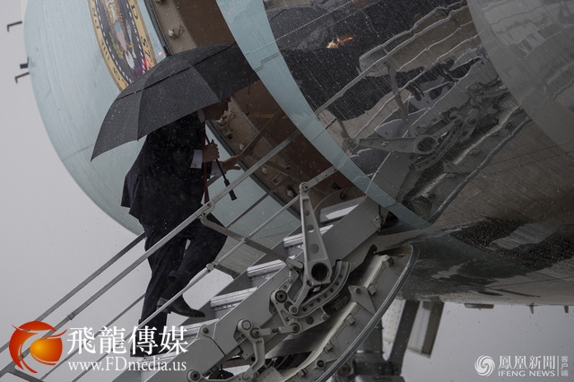 2017年4月6日,美国马里兰州安德鲁斯空军基地,特朗普在大雨中登上空军一号专机,准备前往佛罗里达州与习近平进行会面。