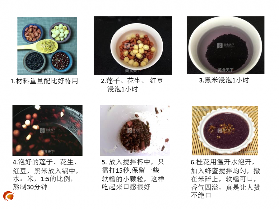 “渐入秋季,各种身体、皮肤、情绪相继出现各种不适迹象,吃一碗用莲子、花生、红豆、黑米等混合在一起的米糊,是调理体内杂尘最好的办法,尤其一颗颗饱满软糯的米粒,如同太极一样,以绵柔的口感,扶平秋季浮躁的情绪,再搭配上具有天然香气的桂花,相互间碰撞出了一种奇妙的化学反应,仿佛万花丛中一点红的微妙,用勺子轻轻搅拌,淡淡的香味灌冲整个鼻腔的感觉非常的微妙,这个时候不希望任何人来打扰,只想静静的坐在夕阳下的沙发上发呆,再也没有比这更美好的事儿了!”