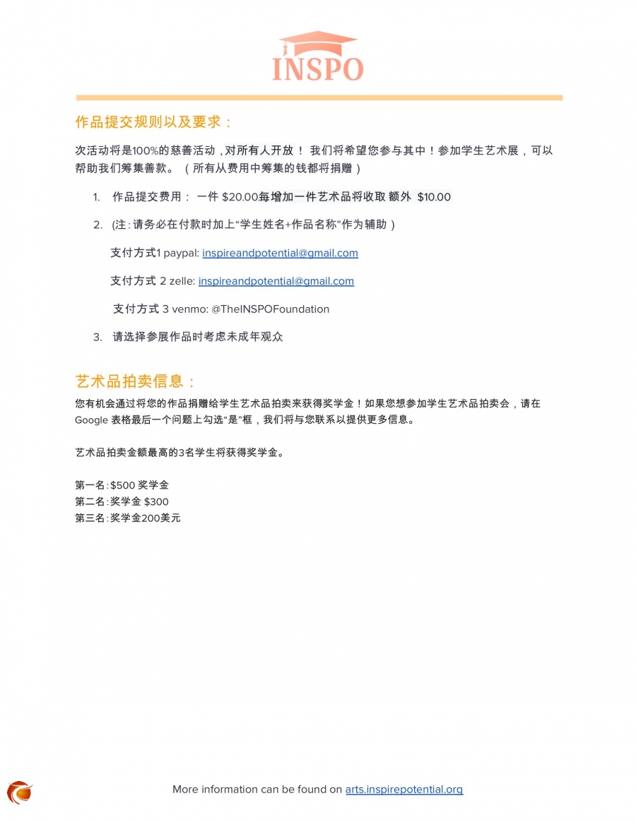 艺术是一种通用的创造性表达方式。十年间,数以千计的青少年/青年艺术爱好者走进美国休斯顿 中国艺术中心的大门,在这里激发他们的艺术激情,为他们提供优质的教育和创作环境。INSPO 是一家 501(c)(3) 非营利组织,致力于让贫困学生发挥最大的学习潜力. 为了这些怀着对艺术的梦 想又才华横溢的青少年以及青年,INSPO 与美国休斯顿中国艺术中心联合举办了此次的艺术展 览。此次艺术展的目的不仅仅是为这些青少年艺术家提供一个展示他们作品的机会和平台,而且 还将帮助一些在经济上有需要的青少年/青年艺术爱好者们进一步的激发他们对的艺术热情,为 他们提供经相应的经济援助。