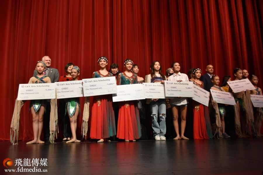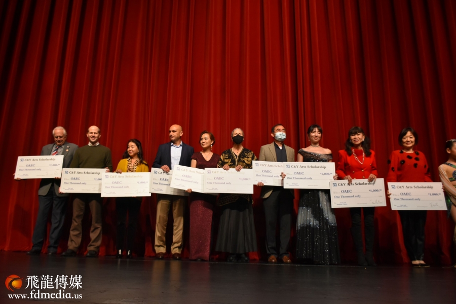 嘉宾为优秀学生颁发C&Y奖学金,左起:斯坦福市市长Cecil Willis,亚协文化表演艺术导演 Michael Buening,休斯敦犹太博物馆董事会秘书长,美中友好协会主席李娟,Founder and CEO for both Harmony Public Schools and Royal Public School System Dr. Soner Tarim, 腾龙教育学院院长俞晓春,Dance Salads Festival Founder and Director Nancy Henderek, OAEC 重要嘉宾 乐庆, OAEC 董事长陈芹, Stafford City Council 谭秋晴,前哈瑞斯郡法官,現任德州藝術委員會委員Teresa Chang 张文华女士。