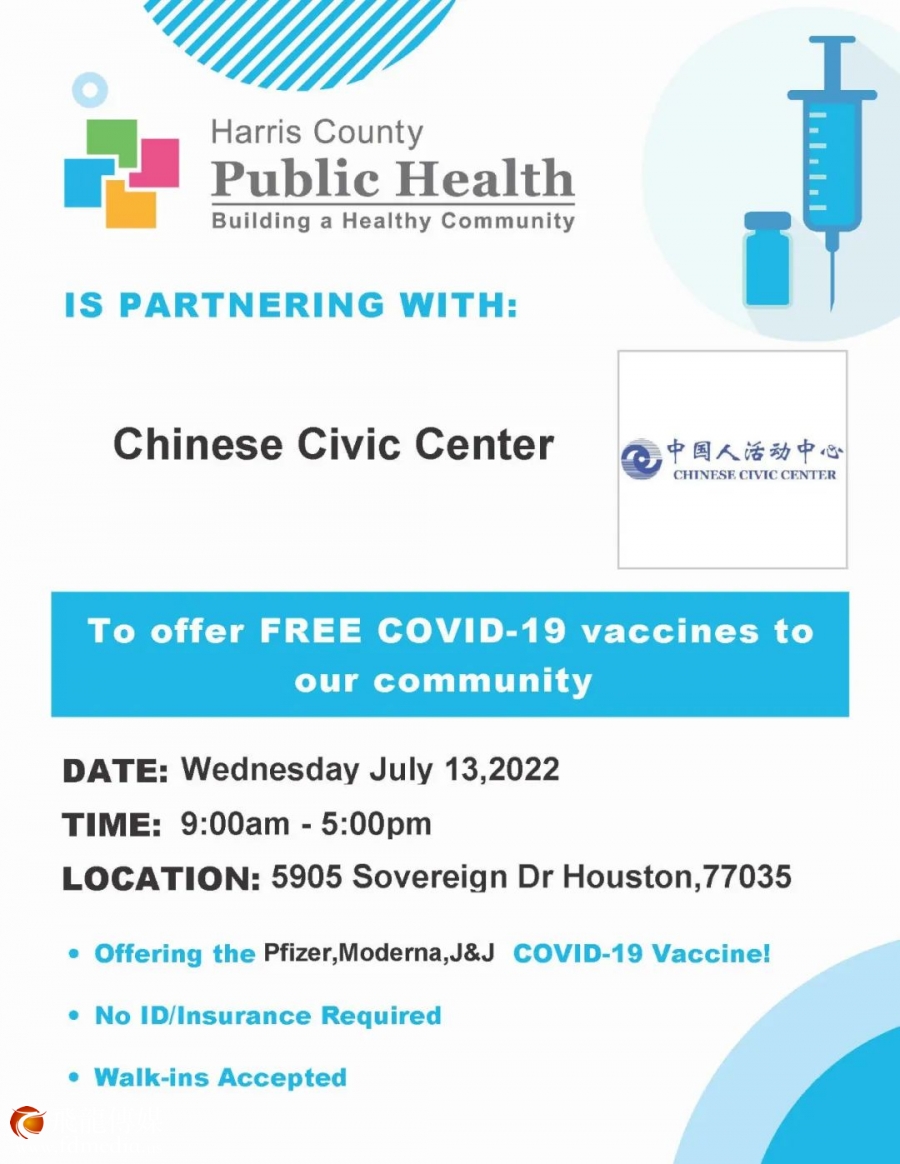 Harris County Public Health (HCPH) is partnering with the Chinese Civic Center in Houston to provide COVID-19 vaccines to the community on Wednesday July 13th, 2022.