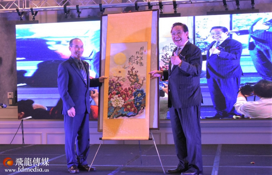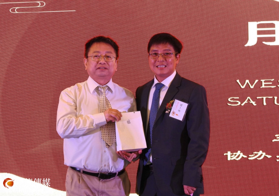 美南报业电视传媒集团董事长李蔚华上台见证“牡丹王子“ 江宜桥为中秋晚宴特别的大作。卢耀辉摄影
