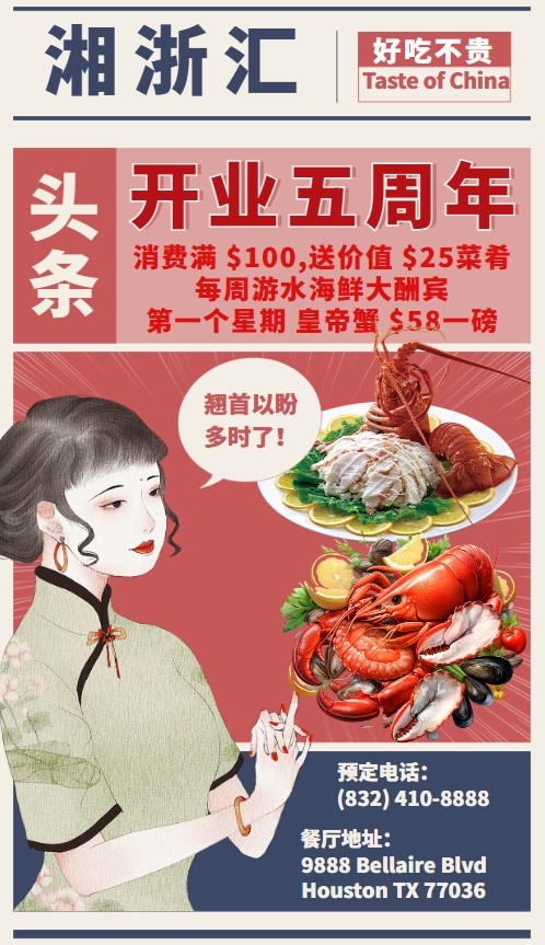 为了回报广大客户的支持,湘浙汇餐厅即日起举行五周年大酬宾活动,每一个星期提供游水海鲜优惠大酬宾,首先提供的是皇帝蟹每磅$58,另外消费满$100送价值$25的特色菜肴,精美菜色任您点!和家人朋友约起来吧!千万别错过品尝美味佳肴的好机会。