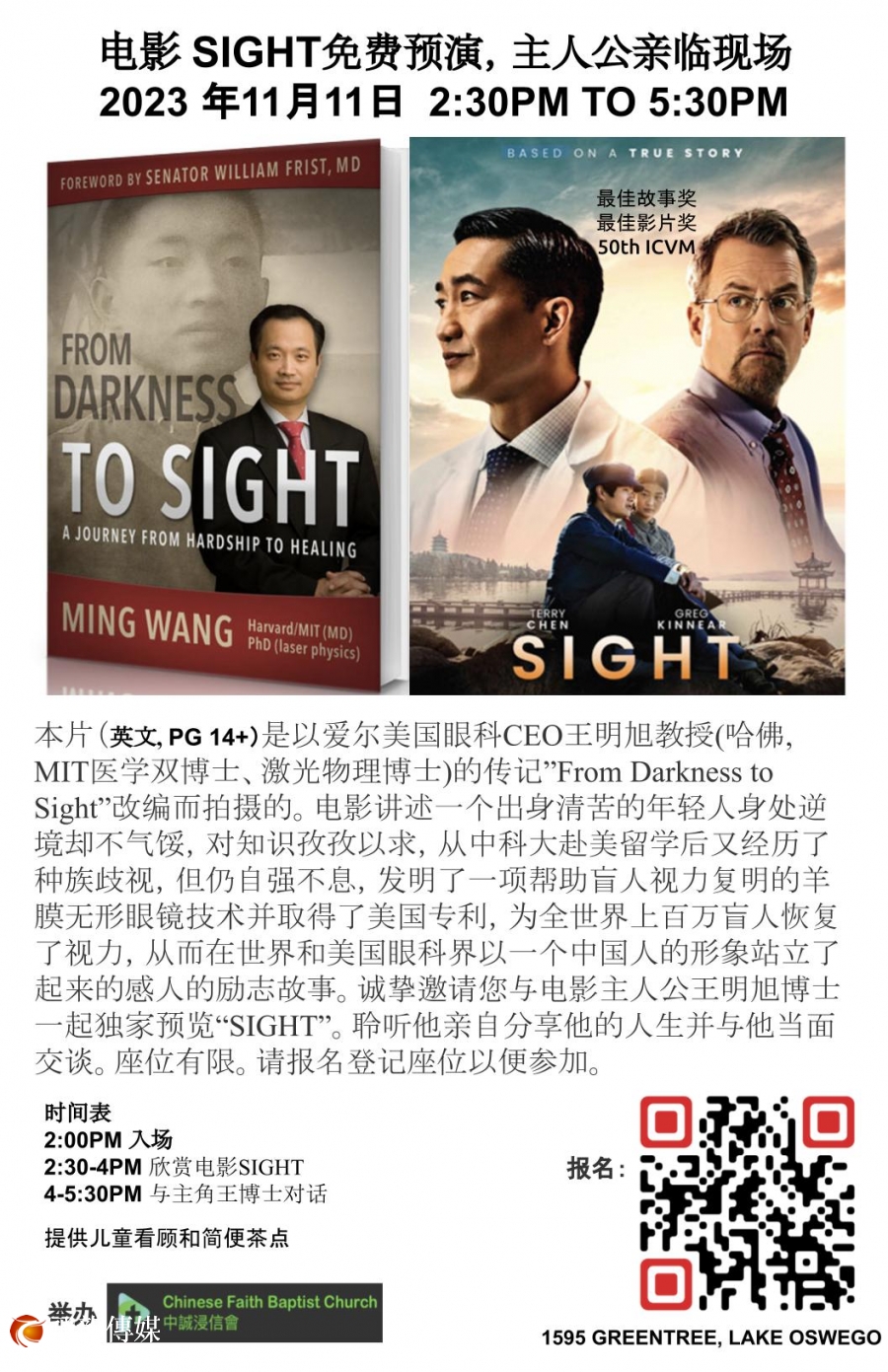 2023年11月10-11日,享誉美国的眼科手术医生王明旭和以他为原型的电影Sight将到俄勒冈州免费播放,为期待已久的俄勒冈华人带来这部在各地华人热播的电影。