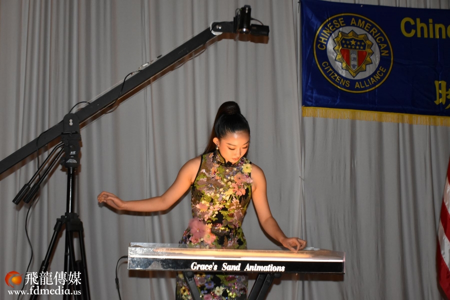當晚2023年休斯頓華埠小姐冠軍張智怡(Grace Zhang) 為晚宴做了沙畫表演。