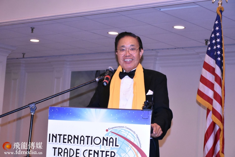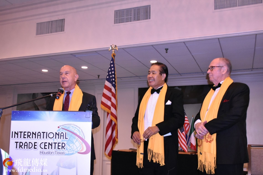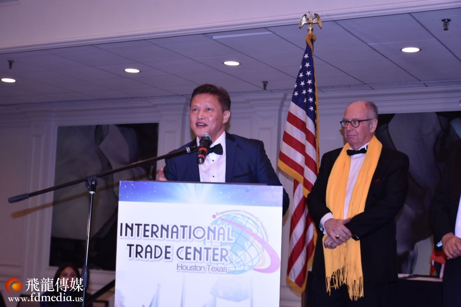 国际贸易中心主席、美南新闻集团董事长李蔚华先生致欢迎辞!他说:今晚我非常荣幸地在此和社区领袖及休斯顿政商外交领事代表共聚一堂, 庆祝国际贸易中心二十一岁生日。45年前, 我和内人提着简单之行囊从德州博蒙市拉马尔大学来到休斯顿 ,从此就把休斯顿当成自己的家, 在此落地生根。二十年前,在德州州议会代表武候伯之倡议下, 我们成功地经过立法而成立了休斯顿国际区 ,多年来我和在座的许多位理事们成功地把一片荒地耕耘成了本市一个非常繁荣而耀眼的商业区。就在此时, 在座的Glen Gando先生、 金诺威先生和我们一起在国际区内创设了休斯顿国际贸易中心,为 一万五千多中小企业提供了交流的平台。 今晚我们三位中心创始人也同时共同庆祝我们的金婚纪念日,通过我们多年来对社区和国家所作之贡献,及幸福美满的生活是庆祝金婚最大之献礼。