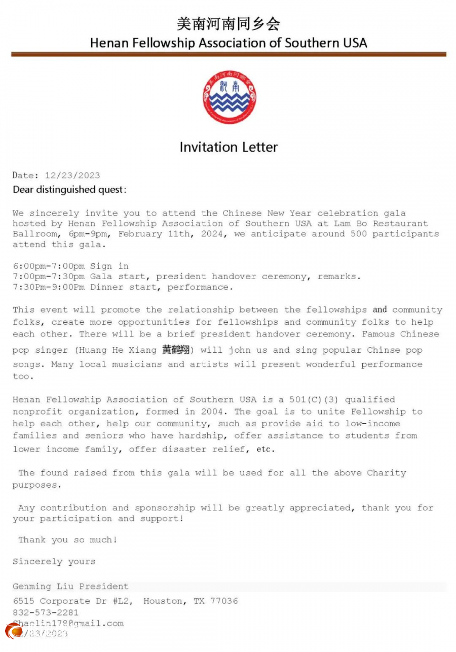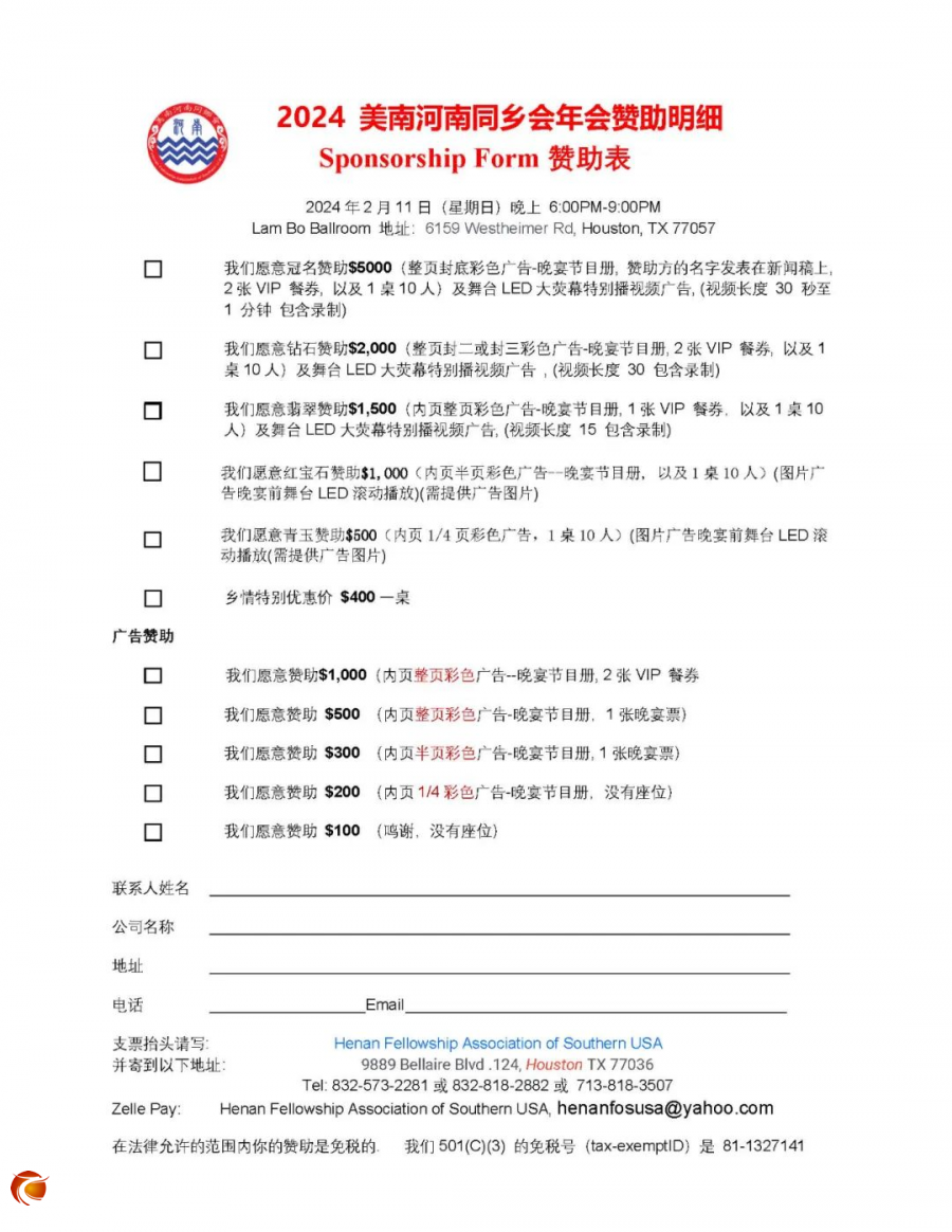 付款方式如下,预留座位以收到付款为准:支票抬头: HenanFellowship Association of Southern USA邮寄地址: 9889 Bellaire Blvd .124, Houston TX 77036Zelle Pay: Henan Fellowship Association of Southern USA, henanfosusa@yahoo.com赞助均可抵税。同乡会有501(C)(3)资质, 免税号(tax-exempt ID)是81-1327141