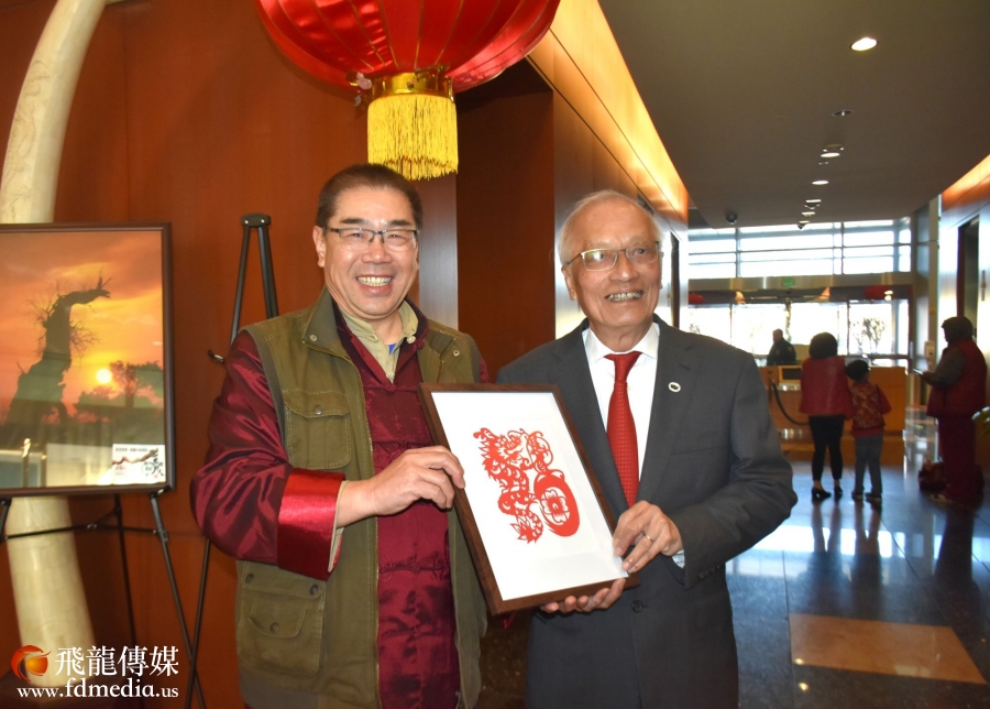 賈忠老師的《龍的傳人》圖片在恆豐銀行展出,吳文龍董事長在公關部經理周明潔的陪同下特別到展區觀賞,賈忠老師特別為吳董事長准備了“龍”字的剪紙。