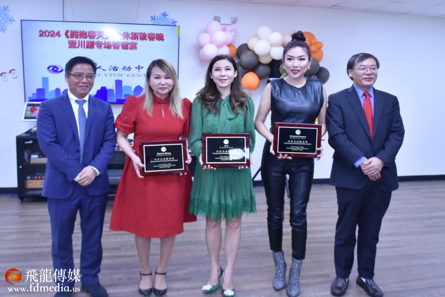 左起:中国人活动中心执行长方一川、拥抱春天晚会共同主席Serene Wong、拥抱春天晚会主席卿梅、拥抱春天晚会共同主席Victoria Powers、中国人活动中心董事长范玉新。