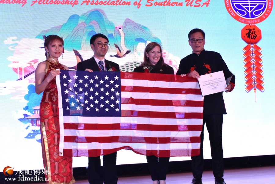 国会议员Lizzie Fletcher从华盛顿带来美国国旗赠送给山东同乡会。