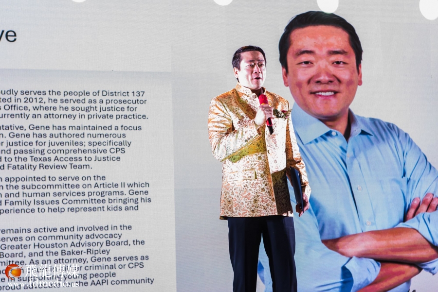 休斯顿大商会主任沈建生、Troy Nehls国会议员代表张晶晶、休斯顿第五区警长候选人Jerry Rodriguez合影。