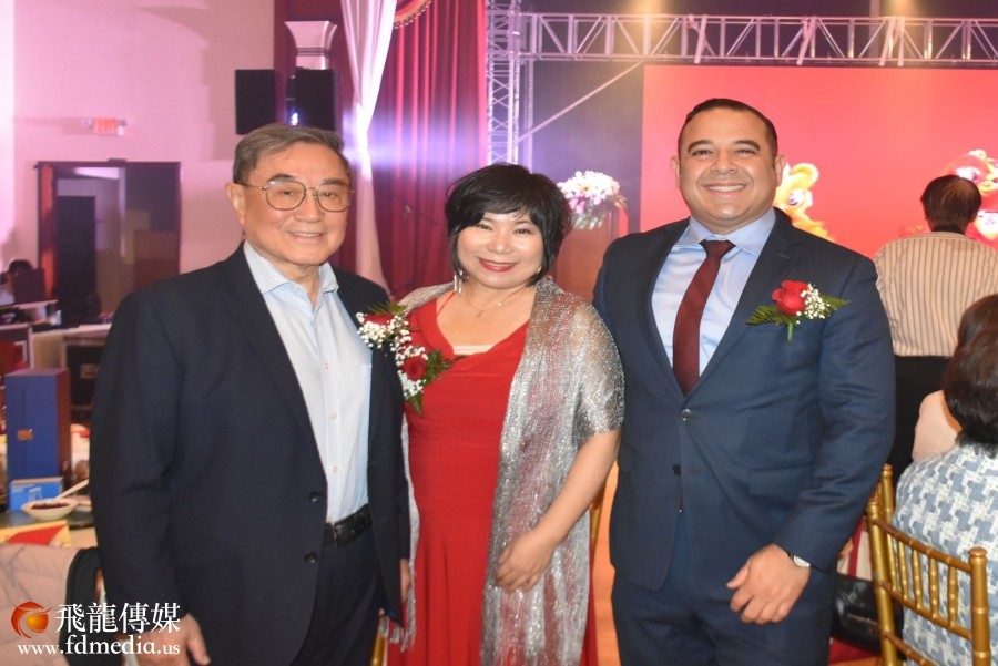 中国人活动中心董事长范玉新、休斯顿第五区警长候选人Jerry Rodriguez、中国人活动中心执行长方一川合影。